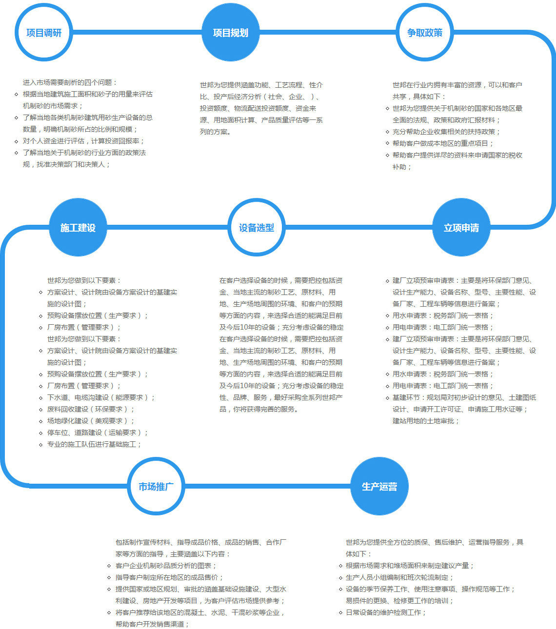 綠色建材工程成套解決方案勢(shì)在必行:無論是從環(huán)保角度考慮,還是從一系列的利好政策、較高的利潤空間等因素出發(fā),發(fā)展綠色建材工程將在未來20年迎來機(jī)遇。作為國內(nèi)“綠色建材裝備”的排頭兵,世邦工業(yè)的綠色環(huán)保成套設(shè)備及方案正蓄勢(shì)待發(fā)。“綠色建材工程成套解決方案”投資增長點(diǎn)——國家政策補(bǔ)貼:低廉原料成本:無論是礦山廢石還是建筑廢棄物,投資者通常以極其低廉的價(jià)格,甚至無成本收購,再通過簡(jiǎn)單預(yù)處理既可作為原材料使用,極大的降低了生產(chǎn)線運(yùn)營成本。