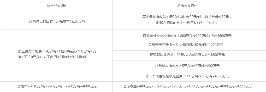 年產(chǎn)200萬(wàn)噸建筑廢棄物生產(chǎn)線經(jīng)濟(jì)核算分析,主要產(chǎn)品為再生骨料40萬(wàn)噸/年、環(huán)保砌塊60萬(wàn)噸/年、干混砂漿40萬(wàn)噸/年、水穩(wěn)材料等40萬(wàn)噸/年。