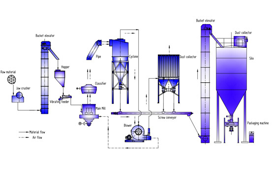 4、集粉階段:符合細度的粉子隨氣流經(jīng)管道進入集粉系統(tǒng),氣粉分離,成品粉由輸送裝置送至成品料倉,再統(tǒng)一用裝粉罐車或者自動打包機進行包裝。