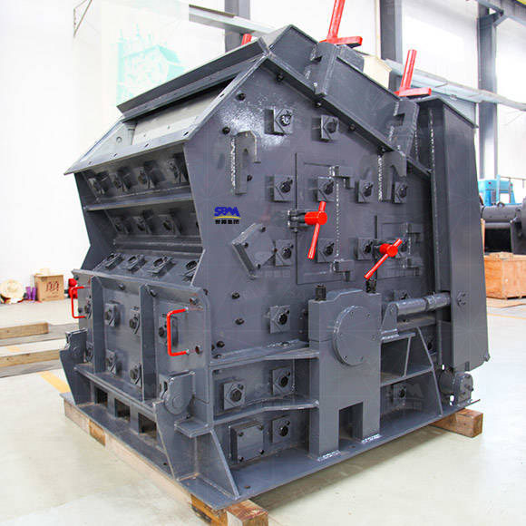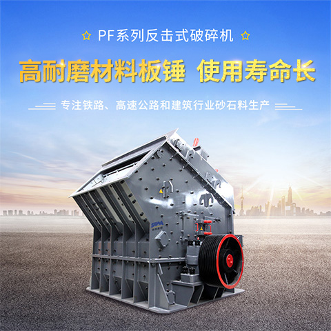PF系列反擊破利用沖擊能破碎物料。轉子在電動機的帶動下高速旋轉,從進料口進入的物料與轉子上的板錘撞擊,受到板錘的高速沖擊被破碎;破碎后的物料又被反擊到襯板上再次破碎;末了從出料口排出。