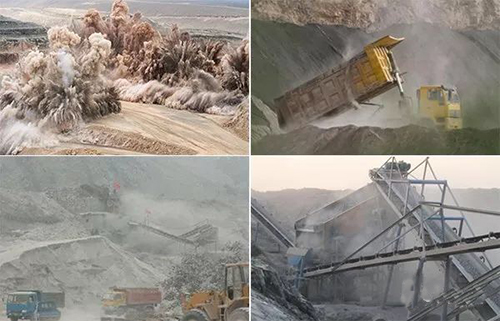 采石場的粉塵主要來源于穿孔、爆破、采裝、裝載、排巖和運(yùn)輸?shù)茸鳂I(yè)過程,其中穿孔作業(yè)是露天采石場細(xì)小粉塵的主要來源,其次爆破作業(yè)會瞬間產(chǎn)生高濃度的粉塵,還伴隨有毒有害的氣體生成,該類氣體對人體的危害更大。