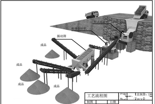 在工程應(yīng)用中,碎石的用量占到砂用量的2倍以上,單獨建立機制砂廠投入較大,供應(yīng)數(shù)量有限,在經(jīng)濟上不太合算,在碎石生產(chǎn)加工系統(tǒng)的基礎(chǔ)上,增加一套立軸式?jīng)_擊破碎機(制砂機)及一套粉塵去除裝置,把經(jīng)過顎式破碎機破碎的回料及部分不同粒徑的石料進入制砂機,分離出不符合級配要求粒徑的石粉形成機制砂。