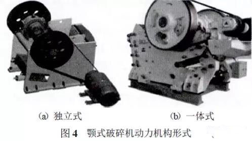 顎式破碎機(jī)動(dòng)力機(jī)構(gòu)如圖4所示,目前動(dòng)力機(jī)構(gòu)形式分為獨(dú)立式和一體式兩種結(jié)構(gòu)。