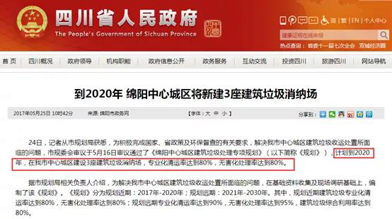 綿陽:到2020年,四川省綿陽中心城區(qū)將新建3座建筑垃圾消納場,專業(yè)化清運率達到80%,無害化處理率達到80%。