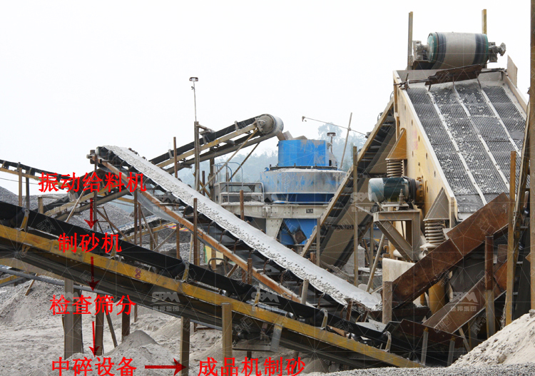 主要的石灰石加工設備為顎破機、反擊破、制砂機以及洗砂機,然后輔助的設備為給料機、振動篩、輸送機等。