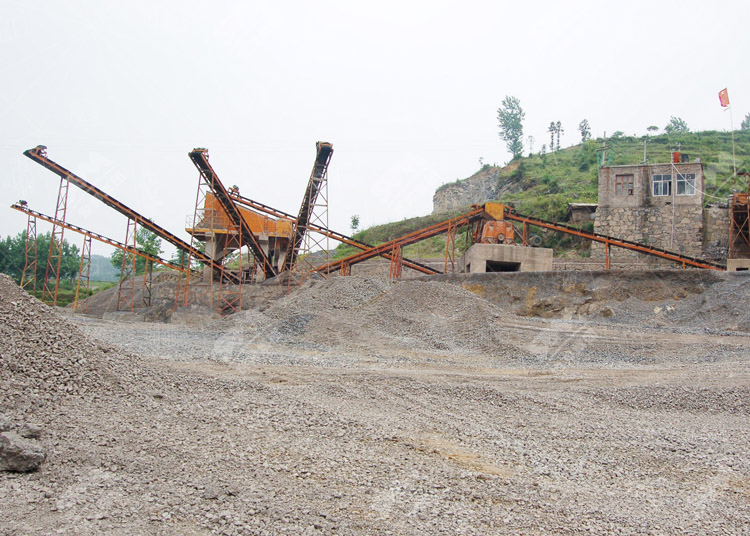 大塊石料經(jīng)料倉由振動給料機均勻的送進顎式破碎機進行粗碎,粗碎后的石料由輸送機送到反擊式破碎機進行進一步破碎,細碎后的石料由輸送機送到振動篩進行篩分,篩分出幾種不同規(guī)格的石子,滿足顆粒要求的石子,由成品輸送機送往成品料堆,不滿足顆粒要求的石子,由輸送機返料送到反擊式破碎機進行再次破碎,形成閉路多次循環(huán),成品粒度可按照用戶的需求,進行組合和分級,為保護環(huán)境,可配置輔助的除塵設(shè)備。