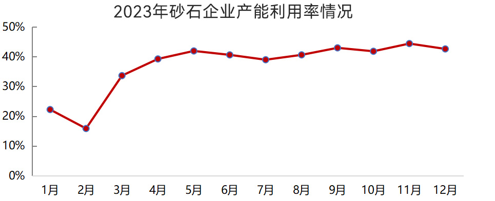 2023年,我國砂石企業(yè)產(chǎn)能利用率和開機率除了年初低位運行以外,其他月份均保持較高水平。1月、2月,我國砂石企業(yè)產(chǎn)能利用率和開機率均值分別為19%、40%,3月~12月,產(chǎn)能利用率和開機率均值分別為41%、66%。
