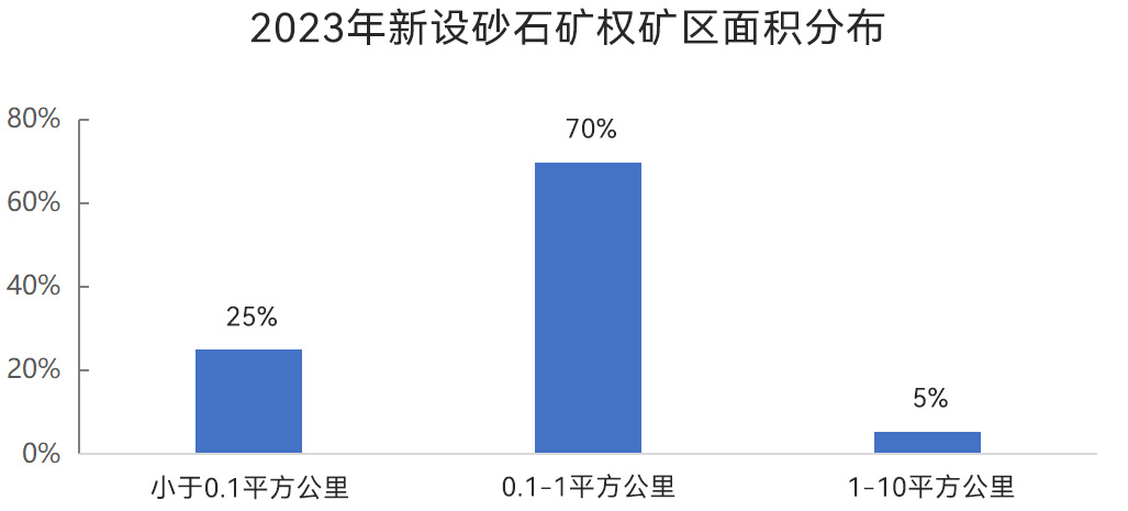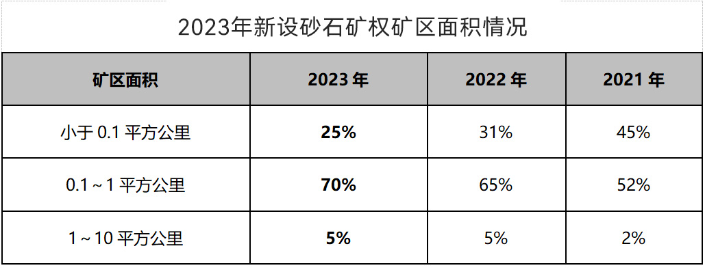 從新設(shè)砂石礦權(quán)礦區(qū)面積來看,砂石行業(yè)規(guī)模化水平進(jìn)一步提升,礦區(qū)面積小于1平方公里砂石礦權(quán)占新設(shè)砂石礦權(quán)70%,成為新設(shè)礦權(quán)的主流。新設(shè)砂石礦權(quán)中,礦區(qū)面積小于0.1平方公里的有228宗,占比為25%,占比較2022年下降6個百分點,新設(shè)小規(guī)模砂石礦權(quán)數(shù)量持續(xù)減少;礦區(qū)面積在0.1~1平方公里之間的新設(shè)砂石礦權(quán)有637宗,占比逐年提升,2023年已經(jīng)達(dá)到70%;礦區(qū)面積在1~10平方公里之間的新設(shè)砂石礦權(quán)49宗,占比為5%。