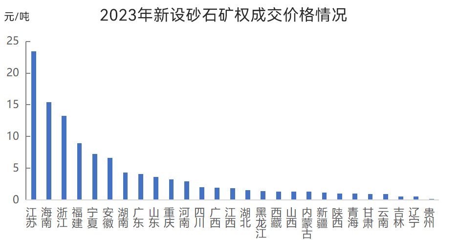 新增砂石礦權(quán)出讓成交價方面:江蘇新設(shè)砂石采礦權(quán)出讓成交均價為23.5元/噸,價格居全國首位,而甘肅、云南、吉林、遼寧、貴州新設(shè)砂石采礦權(quán)出讓成交均價在1元/噸以內(nèi)。
