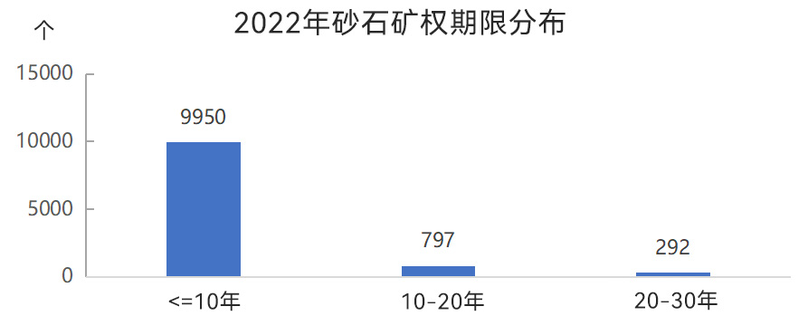 從礦權(quán)期限來看,有效期在10年以內(nèi)的砂石礦權(quán)數(shù)量較多,為9950個,10~20年之間的砂石礦權(quán)797個,20~30年之間的砂石礦權(quán)292個。