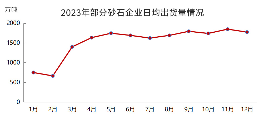 砂石企業(yè)方面:我國砂石企業(yè)產(chǎn)能利用率和開機率除了年初低位運行以外,其他月份均保持較高水平。重點砂石企業(yè)日均出貨量1月~2月低位運行,3月~12月升至1694萬噸/日。