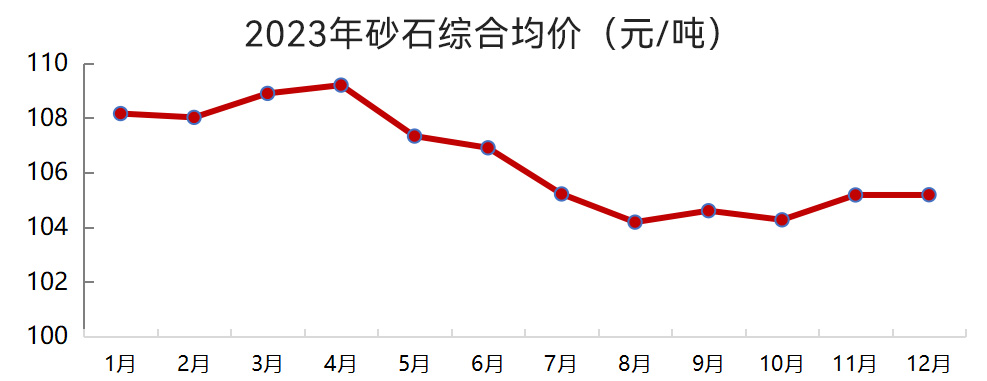 據(jù)中國砂石協(xié)會大數(shù)據(jù)中心統(tǒng)計,2023年12月,我國砂石綜合均價為105元/噸,較2023年1月下降2.7%。