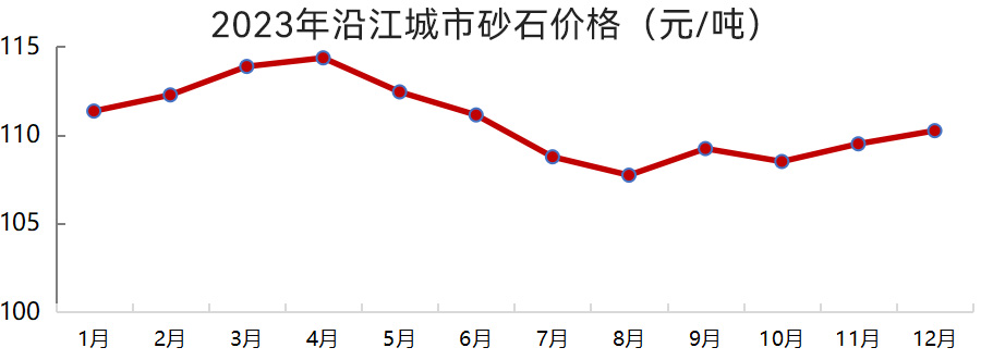 沿江、沿海城市砂石價格也整體呈下滑趨勢,其中二季度需求偏弱,砂石價格下滑較為明顯。12月,沿江、沿海城市砂石均價分別為110元/噸、106元/噸,較2023年年初分別下跌1.3%、1.0%。