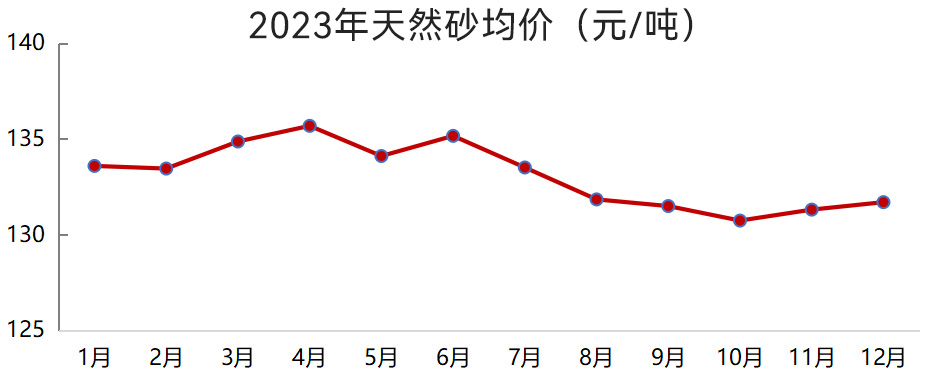 2023年12月,我國機制砂均價94元/噸,較年初下降4.3%;天然砂均價132元/噸,較年初下降1.4%。