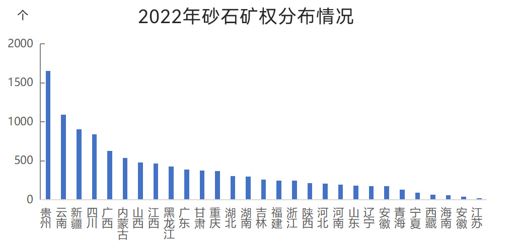 截至2022年年底,我國有效期內(nèi)砂石礦權(quán)11039個,從各?。ㄗ灾螀^(qū)、直轄市)砂石礦山的分布情況來看,貴州、云南砂石礦山數(shù)量較多,分別為1653個、1089個;新疆、四川、廣西、內(nèi)蒙古砂石礦山數(shù)量為500~1000個;山西、江西、黑龍江、廣東、甘肅、重慶、湖北砂石礦山數(shù)量為300~500個;湖南、吉林、福建、浙江、陜西、河北、河南、山東、遼寧、安徽、青海砂石礦山數(shù)量為100~300個;寧夏、西藏、海南、安徽、江蘇砂石礦山數(shù)量均在100個以內(nèi);北京、天津、上海砂石礦山數(shù)量為0。