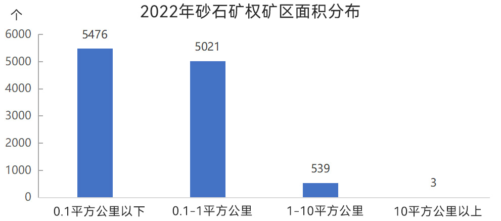 從礦區(qū)面積來看,0.1平方公里以下砂石礦權(quán)數(shù)量較多,為5476個,0.1~1平方公里砂石礦權(quán)5021個,1~10平方公里砂石礦權(quán)539個,10平方公里以上砂石礦權(quán)3個。