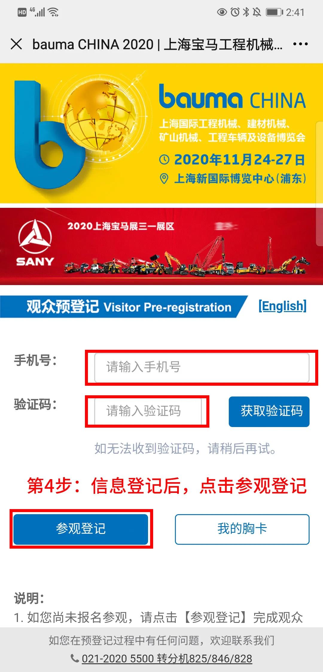 4. 填寫手機號及驗證碼,點擊【參觀登記】