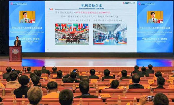 在主旨演講環(huán)節(jié),中國砂石協(xié)會胡幼奕會長做了《砂石工業(yè)步入高質(zhì)量發(fā)展新軌道》的主旨報告。胡會長不僅從國家和地方政府發(fā)布的政策、未來經(jīng)濟發(fā)展趨勢、砂石骨料的市場需求等層面深度解析了目前砂石行業(yè)的發(fā)展狀況,更從行業(yè)角度深度剖析了砂石行業(yè)的未來發(fā)展方向和發(fā)展模式,指出高品質(zhì)機制砂將是未來基建用砂石主要供應源,所以砂石企業(yè)要充分利用礦石產(chǎn)業(yè)得天獨厚的條件,要敢于思變,通過理念、科技、模式等全方位的顛覆創(chuàng)新,為砂石產(chǎn)業(yè)綠色發(fā)展和高質(zhì)量發(fā)展提供堅實支撐,在保護好環(huán)境的同時讓礦山產(chǎn)業(yè)高質(zhì)量發(fā)展。