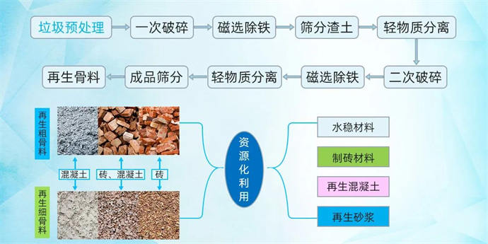 2 環(huán)保智能生產工藝,通過分揀、破碎、篩分、磁選、分離、整形等工藝,產出成品料可用作再生骨料、拌和混凝土及制成再生磚,實現變廢為寶