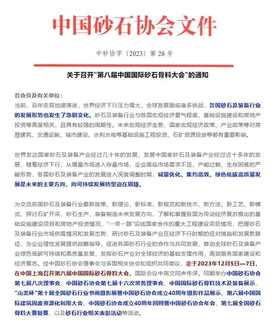 2023年12月5日-7日,由中國(guó)砂石協(xié)會(huì)主辦,世邦工業(yè)·黎明重工承辦的“第八屆中國(guó)國(guó)際砂石骨料大會(huì)”將于上海市浦東新區(qū)召開。