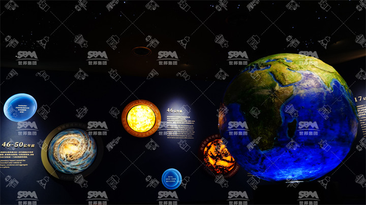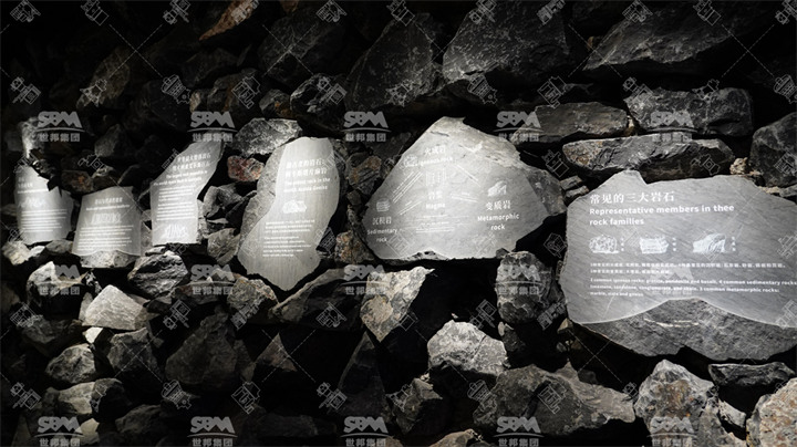 推門(mén)而入,映入眼簾的便是利用3D打印技術(shù)造的小型宇宙,還原了宇宙50億年的滄桑巨變。同樣結(jié)合3D打印技術(shù),我們制作了一個(gè)仿真地球,較大程度還原了地球表層的地質(zhì)地貌。在巖石的分類區(qū),您可以看到由1815塊石頭砌成的礦洞,這些石頭均來(lái)自世邦自有石料礦,包含火成巖、沉積巖、變質(zhì)巖。