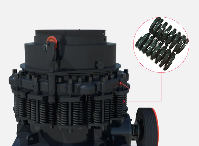 為了防止鐵塊等非破碎物料進(jìn)入破碎腔時(shí)造成破碎機(jī)出現(xiàn)悶車(chē)過(guò)載等突發(fā)情況,我們?cè)贑S圓錐破周?chē)惭b了16組高性能合金鋼彈簧,且以彈簧組為核心的過(guò)載保護(hù)系統(tǒng)能有效保障破碎機(jī)的安全。