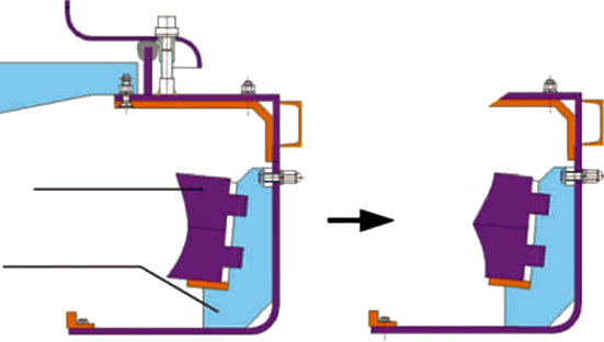 根據(jù)生產(chǎn)實(shí)際,我們發(fā)現(xiàn)周護(hù)板多由中部開始磨損,采用一體式周護(hù)板的情況下,當(dāng)中部嚴(yán)重磨損時,就需要更換整塊護(hù)板,進(jìn)而增加易損件使用成本;而采用世邦工業(yè)改進(jìn)的分體式設(shè)計(jì)后,中部磨損后可以上下調(diào)頭使用,極大延長了周護(hù)板使用壽命,降低易損件成本耗費(fèi)。