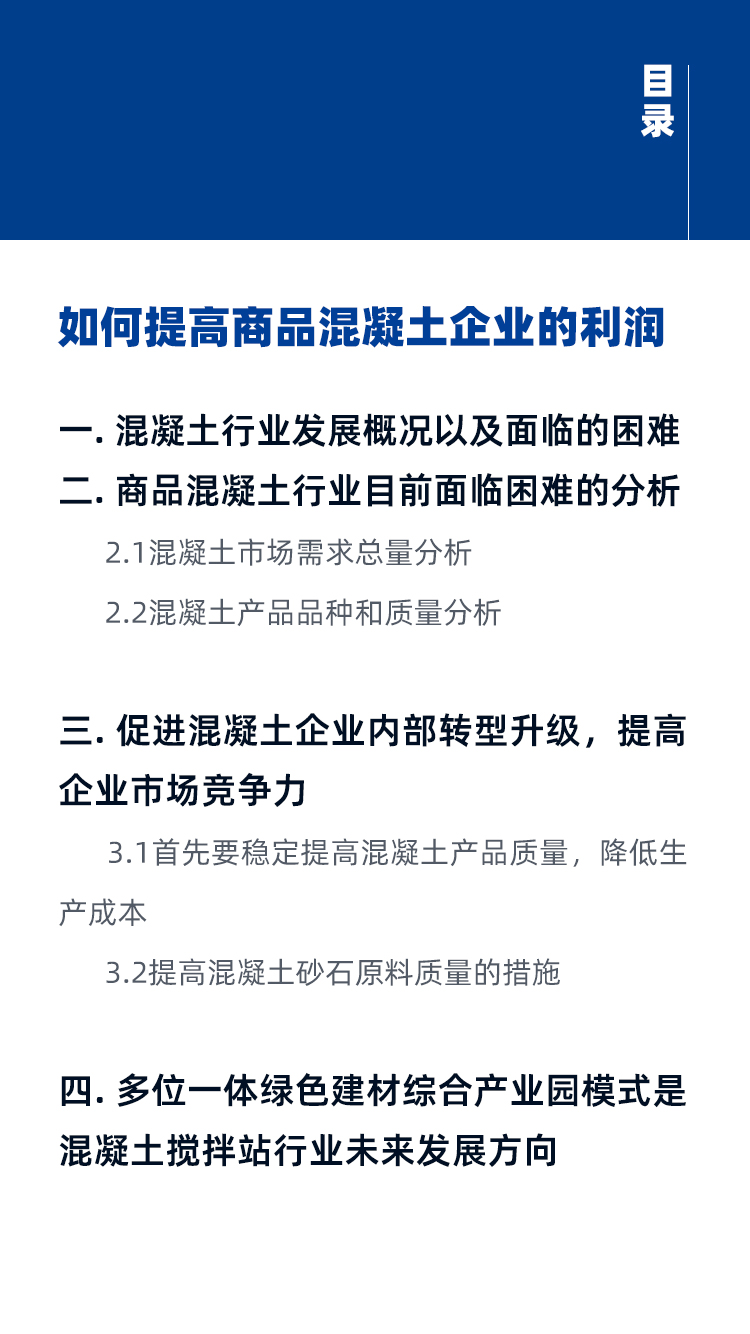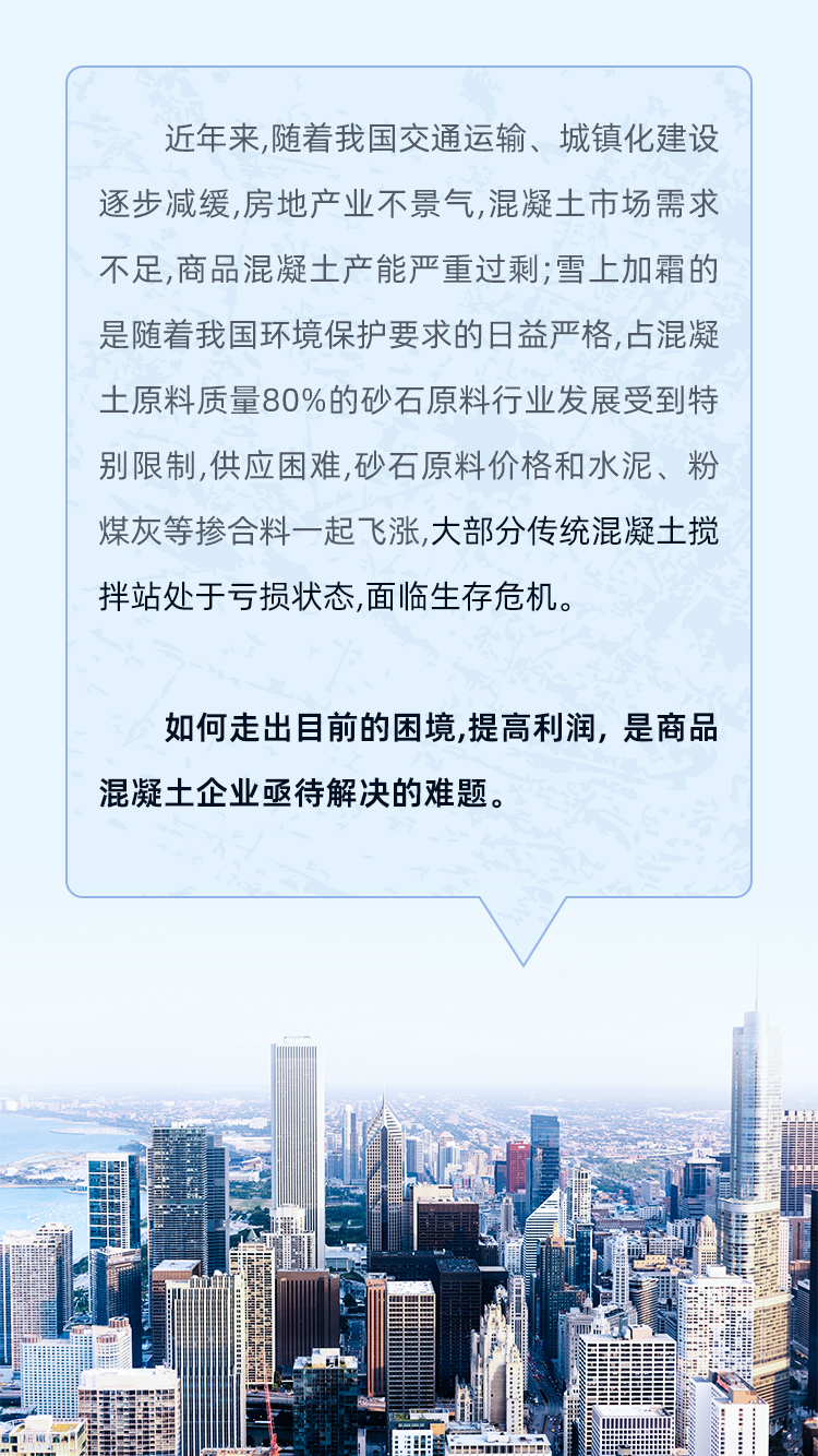 隨著混凝土技術的不斷進步和建筑工程用料要求的逐漸嚴格,部分商品混凝土企業(yè)逐漸暴露出如產能落后、產品單一、成品料無法滿足高品質用料需求等問題。那么如何轉型升級?如何提高混凝土企業(yè)的利潤?如何適應未來混凝土行業(yè)發(fā)展?